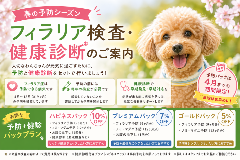 暖かくなるこの時期は、フィラリア予防・ノミ・マダニ予防・健康診断をまとめて行う大切なシーズンです。
