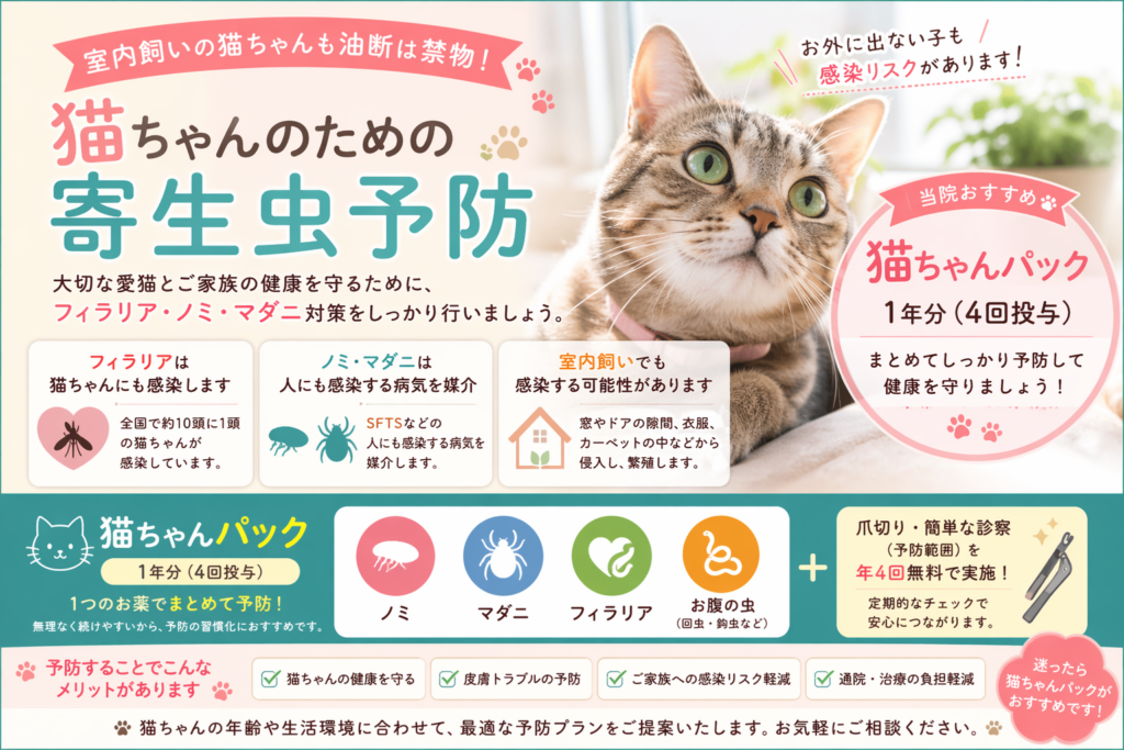 猫ちゃんの健康を守るためにも、フィラリア・ノミ・マダニなどの寄生虫予防をおすすめしています。